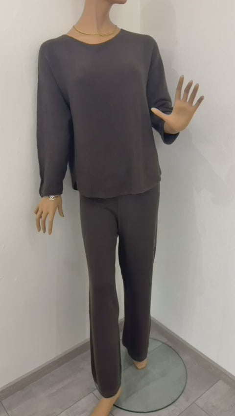Dieses dunkelbraune Zweiteiler-Set bringt pure Eleganz in deinen Alltagskomfort. Das feine Strickmaterial liegt angenehm auf der Haut, ist weich, formstabil und perfekt für gemütliche, aber stilvolle Outfits.