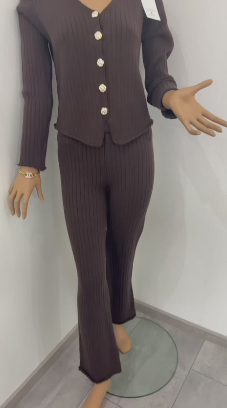 Dieses zweiteilige Rippstrick-Set in tiefem Schokobraun verbindet eleganten Chic mit kuscheligem Tragekomfort. Der fein gerippte Stoff schmiegt sich angenehm an den Körper an, ohne einzuengen – perfekt für alle, die es bequem UND stylisch mögen.