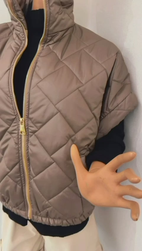 Der hohe Stehkragen schützt vor Wind und setzt gleichzeitig ein stilvolles Statement. Der goldfarbene Reißverschluss sorgt nicht nur für Funktionalität, sondern rundet die Weste mit einem eleganten Akzent ab. Der elastische Saum gewährleistet eine schmeichelhafte, bequeme Passform.